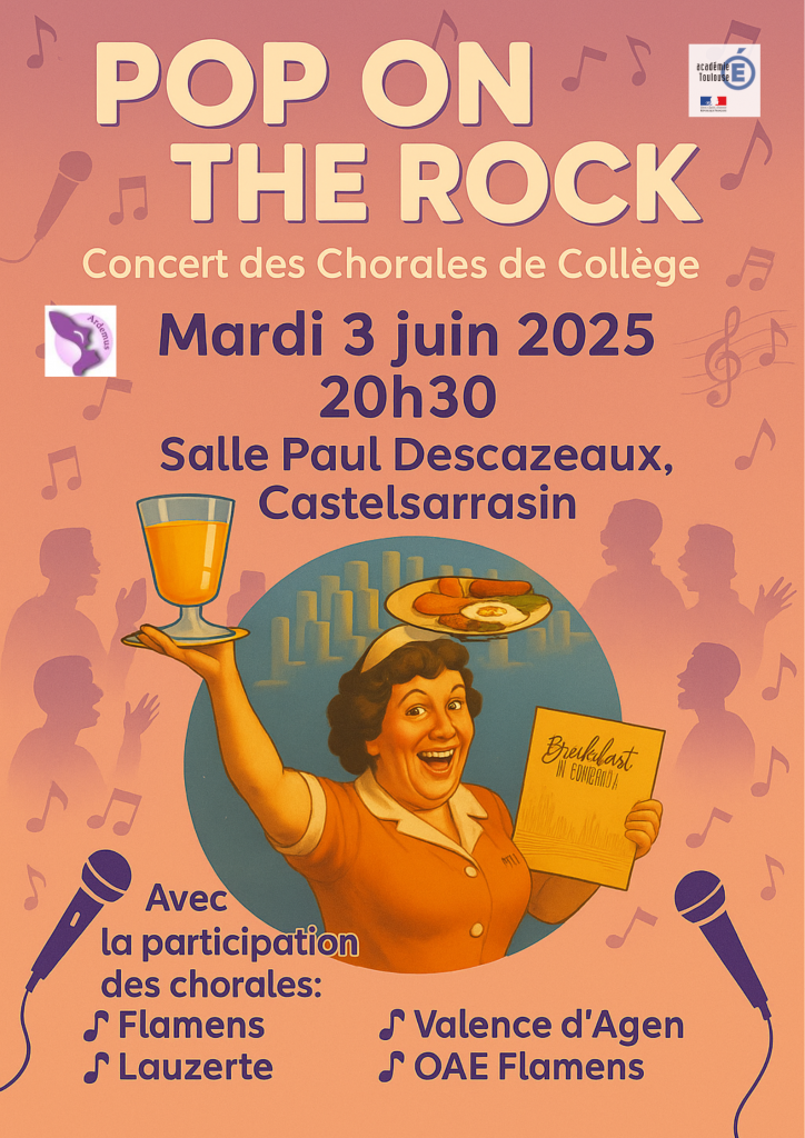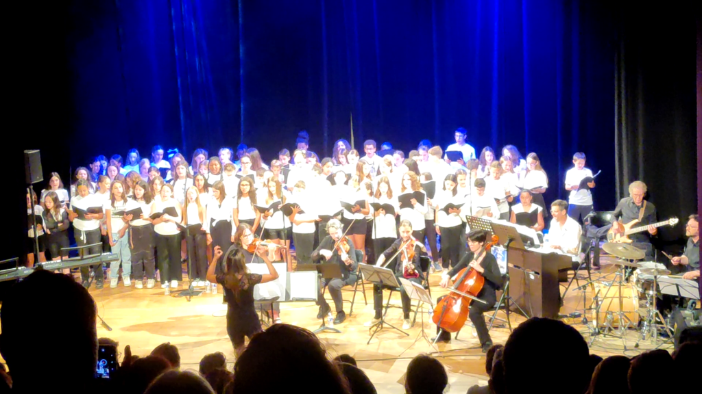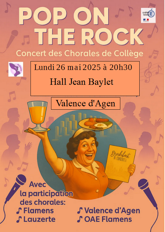 Un spectacle Pop Rock » autour de chansons de Supertramp et autres accompagnées par un ensemble de musiciens professionnels constitué outre les professeurs de l’école de musique partenaire, d’un quatuor à cordes et pour certaines chansons de l’OAE (cordes/claviers/percussions) du collège.
