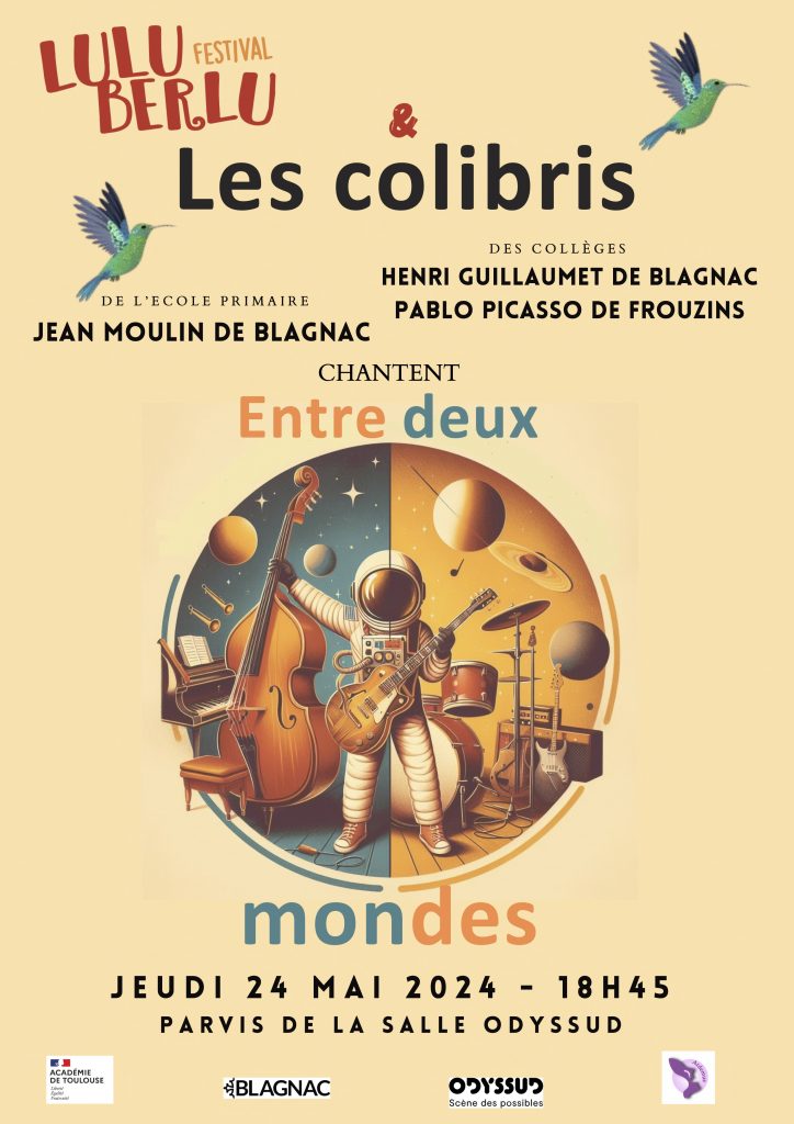 Les Colibris s’envolent encore un peu plus haut cette année, entre le jazz et la chanson pop, invités à explorer des Terres inconnues dans le cadre du Festival Luluberlu 2024 de la ville de Blagnac. Du CM2 à la 3ème, nos fiers volatiles mélomanes zinzinuleront des versions pop de standard de jazz et des versions jazz de pop music accompagnés par le trio stellaire d’Olivier Sabatier